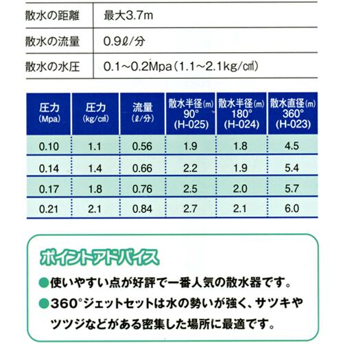 ジェット状に散水を行い、90°・180°・360°の3種類の角度がございます。
